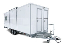 Personalvagn för upp till 8 personer med matsal, omklädningsskåp, dusch och slamtoa med separat dörr utifrån. Vagnen drivs med el 16A.